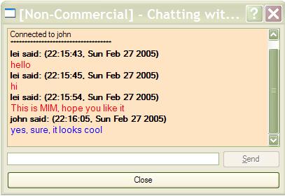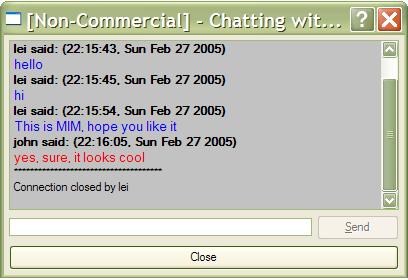 A client "A" can then proceed to chat, after it has retrieved the online user table. To chat with another online user "B", "A" only needs to click on "B" in its online table listview. "A" will be notified that the connection has been set up and is ready to talk. A dialog will pop up to facilitate chat. On the other hand, "B" will also have a dialog pop up, telling "B" who is talking to him and the chat is ready to start.