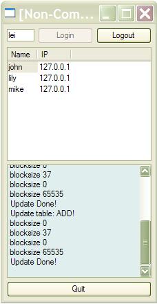 A client tries to connect to the central server on the host specified by an IP address or host name. Its own online list is synchronized with that of the central sever. After a client is connected to the central server, it will create a simple server of its own, in order to accept chat requests from other users (clients).