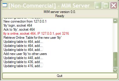 MIM (Mini Instant Messenger) is a simple instant messenger system for X Windows (requires QT, can be build for KDE). It also runs under MS Windows. MIM provides the basic chat functionality. MIM is built upon a simple client/server model, with TCP socket networking.